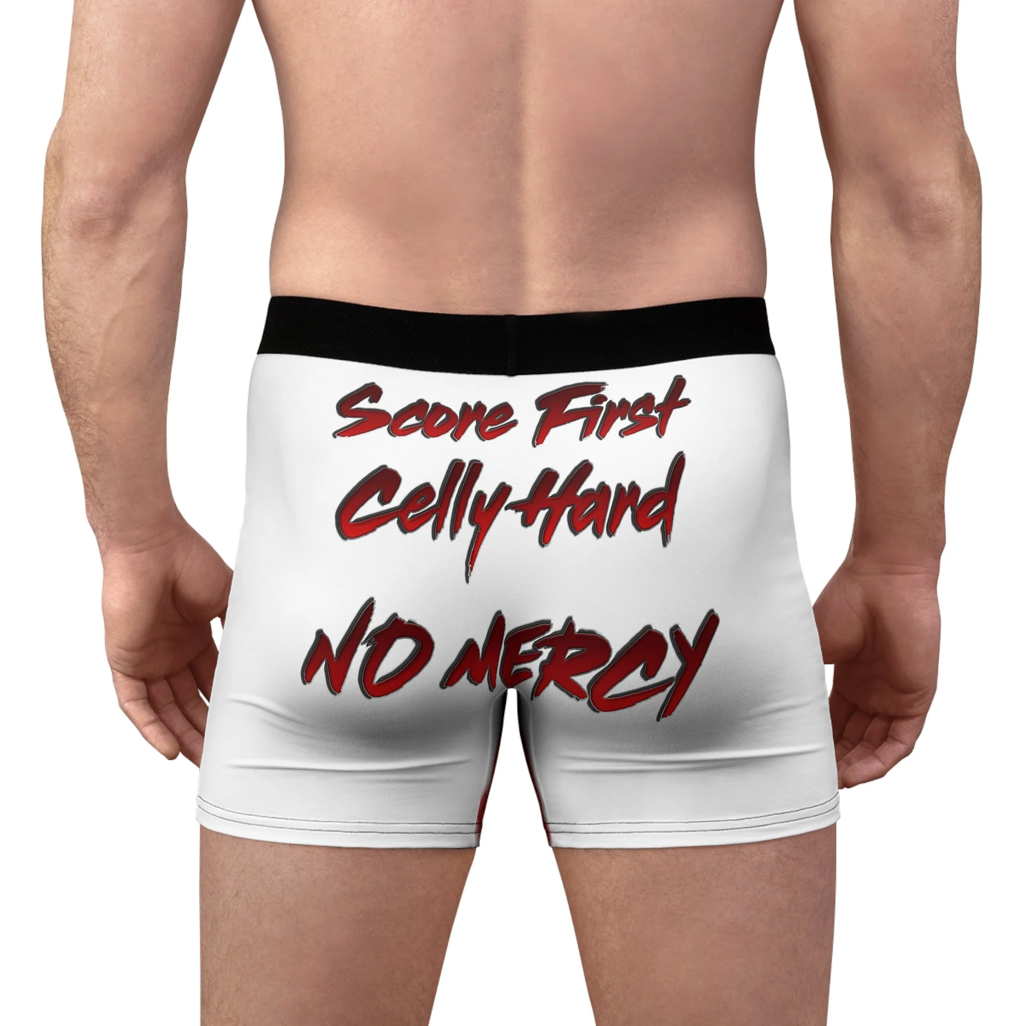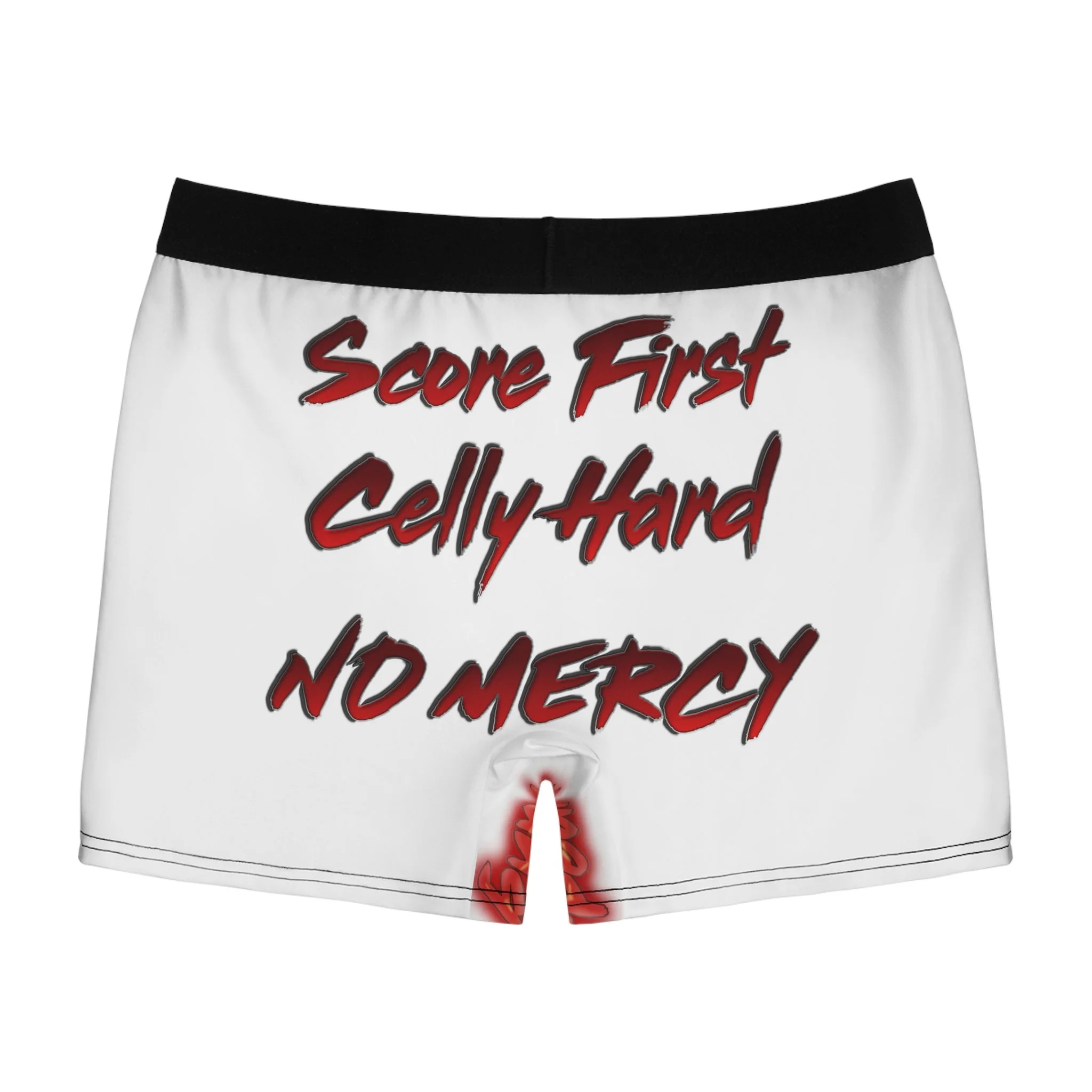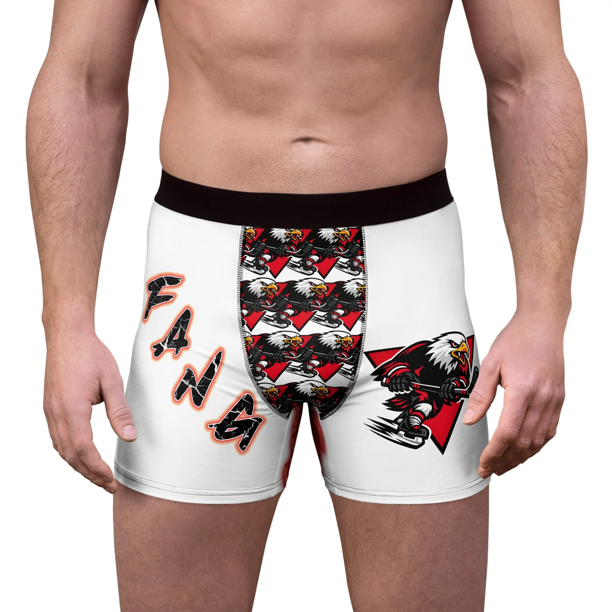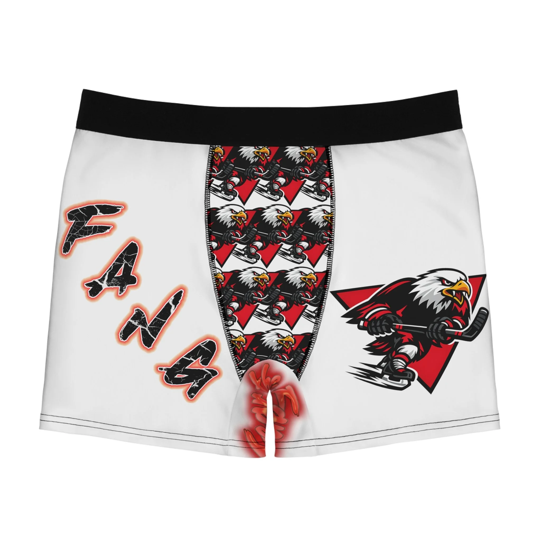 Slip into confidence with these bold, all-over print boxer briefs made for fans who wear their team attitude on every layer. Lightweight, soft-faced polyester wraps the body in crisp, saturated graphics: a fierce eagle mascot in mid-charge, jagged lettering spelling out fandom, and a rallying chant—“Score First, Celly Hard, NO MERCY”—across the back. The trimmed black waistband and breathable cut keep things steady during long days, while the stretchy fabric moves with you and keeps colors sharp wash after wash. These briefs aren’t just underwear — they’re a statement under your game-day kit or everyday wear, a private reminder of the grit and roar you bring to the rink.