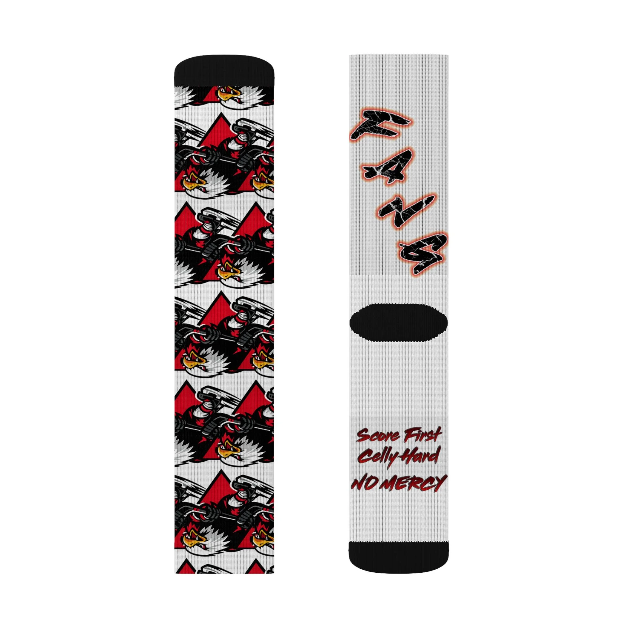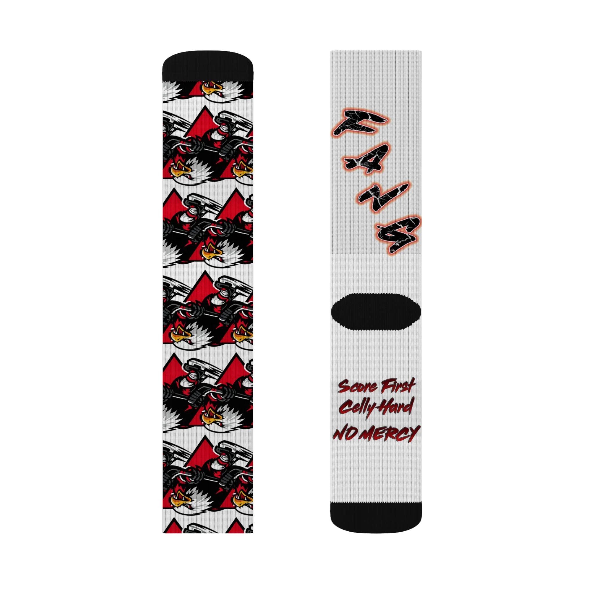 Slide into socks that bring attitude and warmth to every step. These crew-length sublimation socks wrap your calves in an all-over graphic of bold red and black motifs with a fierce mascot and edgy lettering that reads “FANG” and a spirited rallying cry. Inside, a fleece lining cushions your soles so each stride feels soft and insulated. The ribbed tube holds the sock in place while cushioned bottoms and a stretch blend of polyester and spandex deliver lasting comfort and shape. Wear them on game days, chilly walks, or whenever you want your footwear to shout personality without sacrificing cozy support.