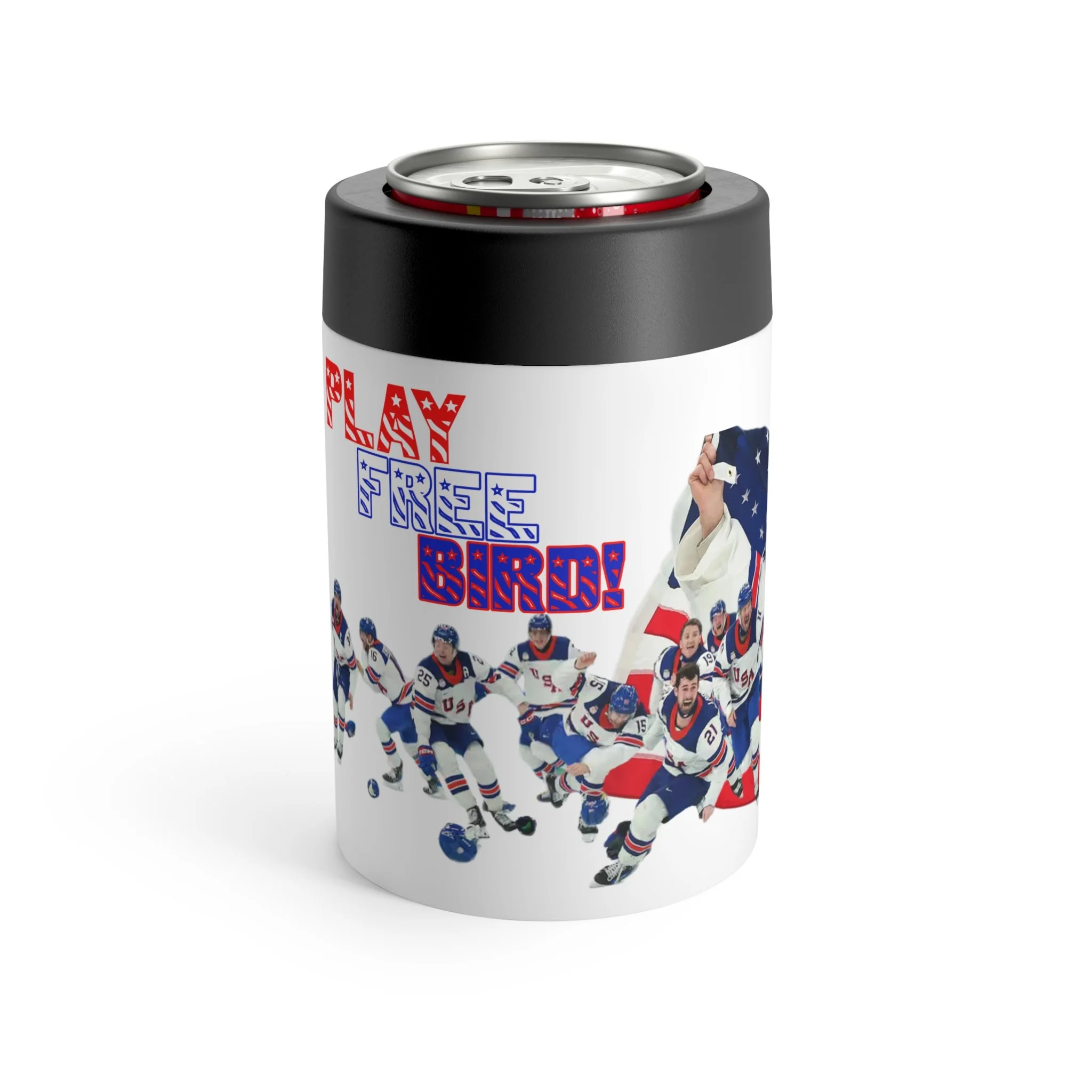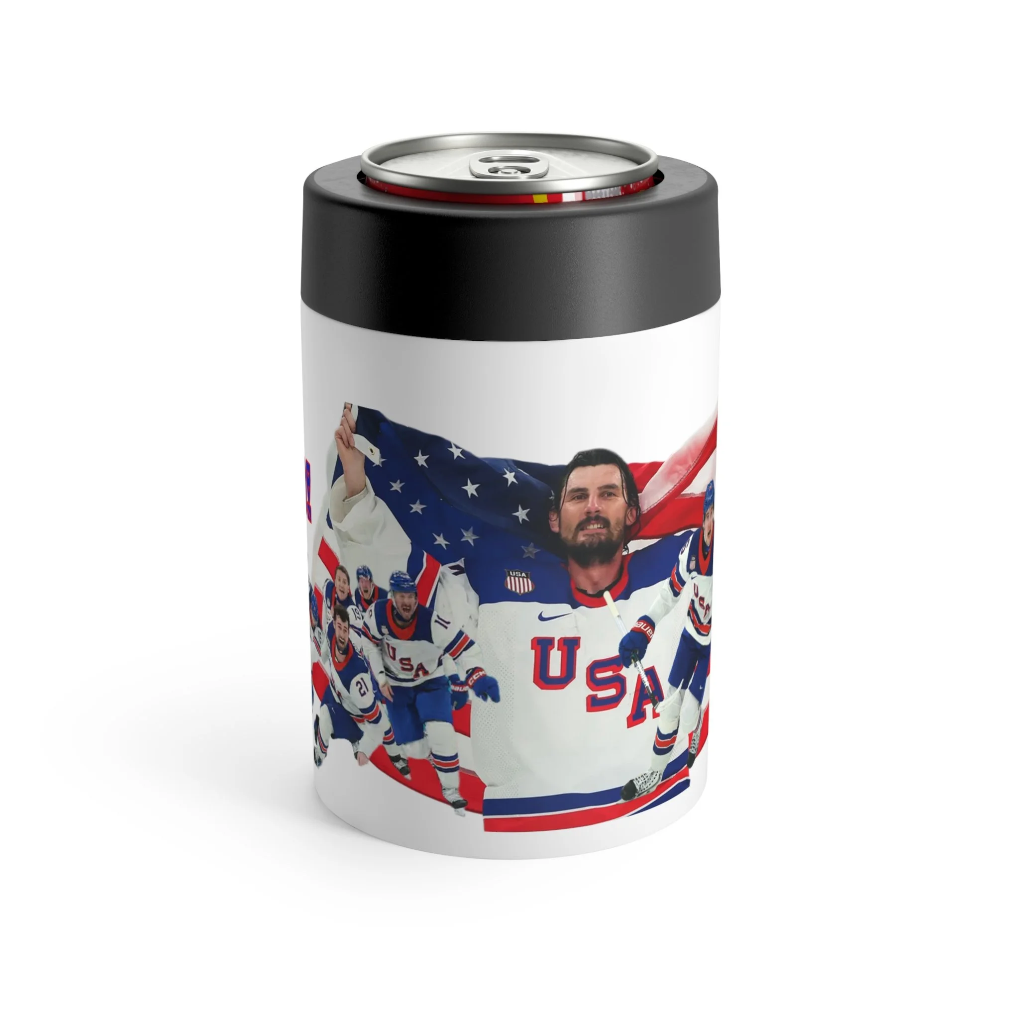 Celebrate game-night pride with this insulated can holder that keeps your drink cold while showing off fandom. The wraparound design features USA hockey imagery and patriotic accents, bringing high-energy rink moments to backyard barbecues, tailgates, and post-game hangs. Lightweight and quiet in hand, it slips into a cooler or sits on your table without leaving rings. Use it when you want your beverage to stay refreshingly cold and your team spirit front and center.