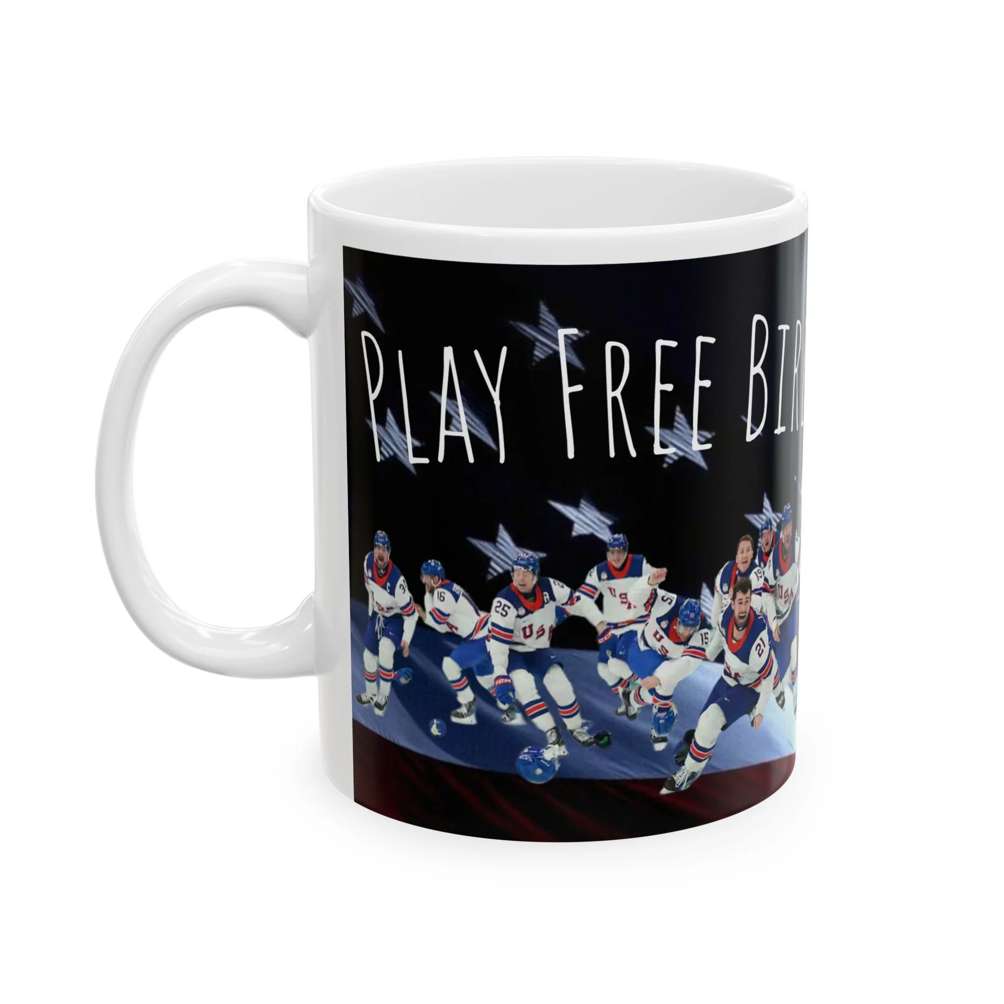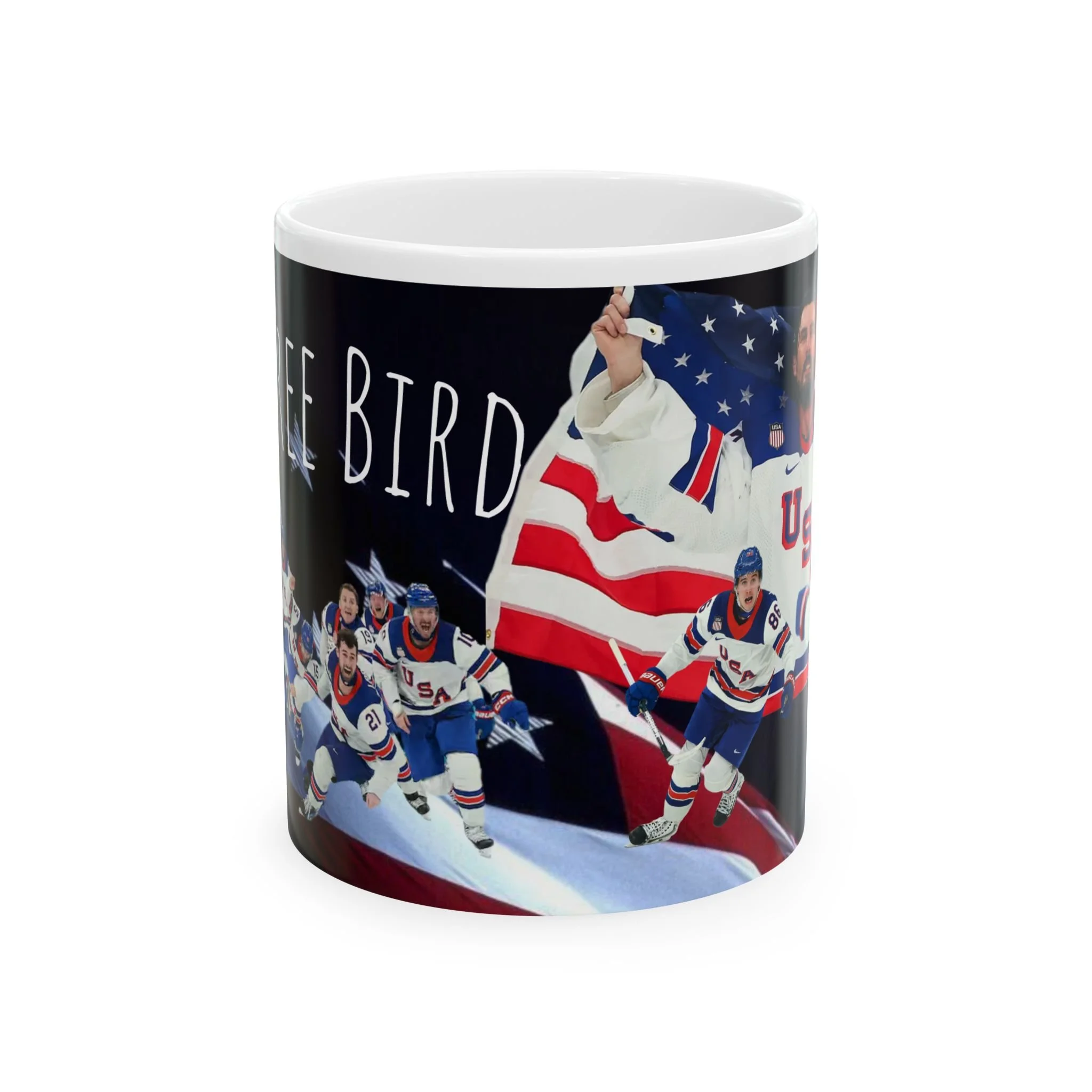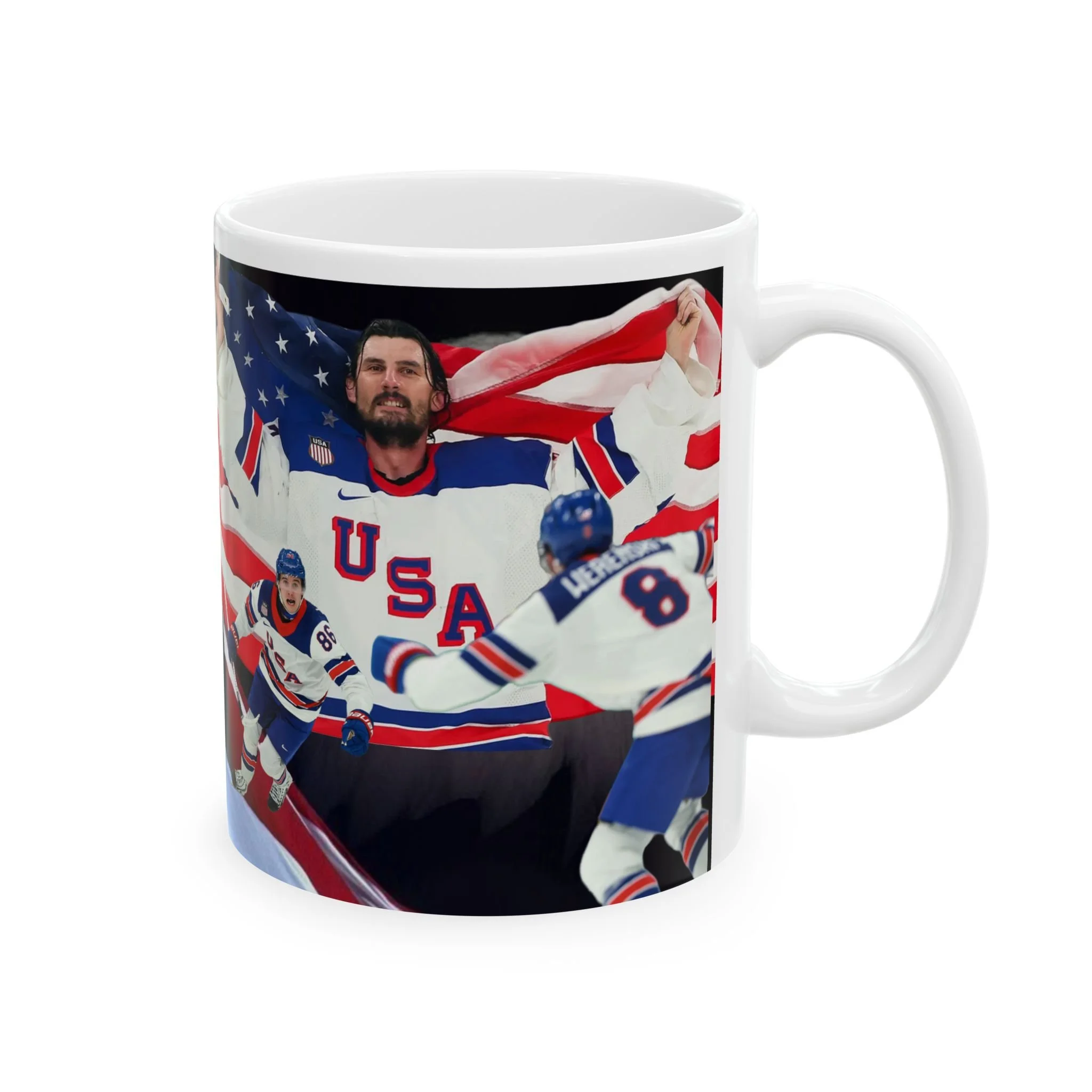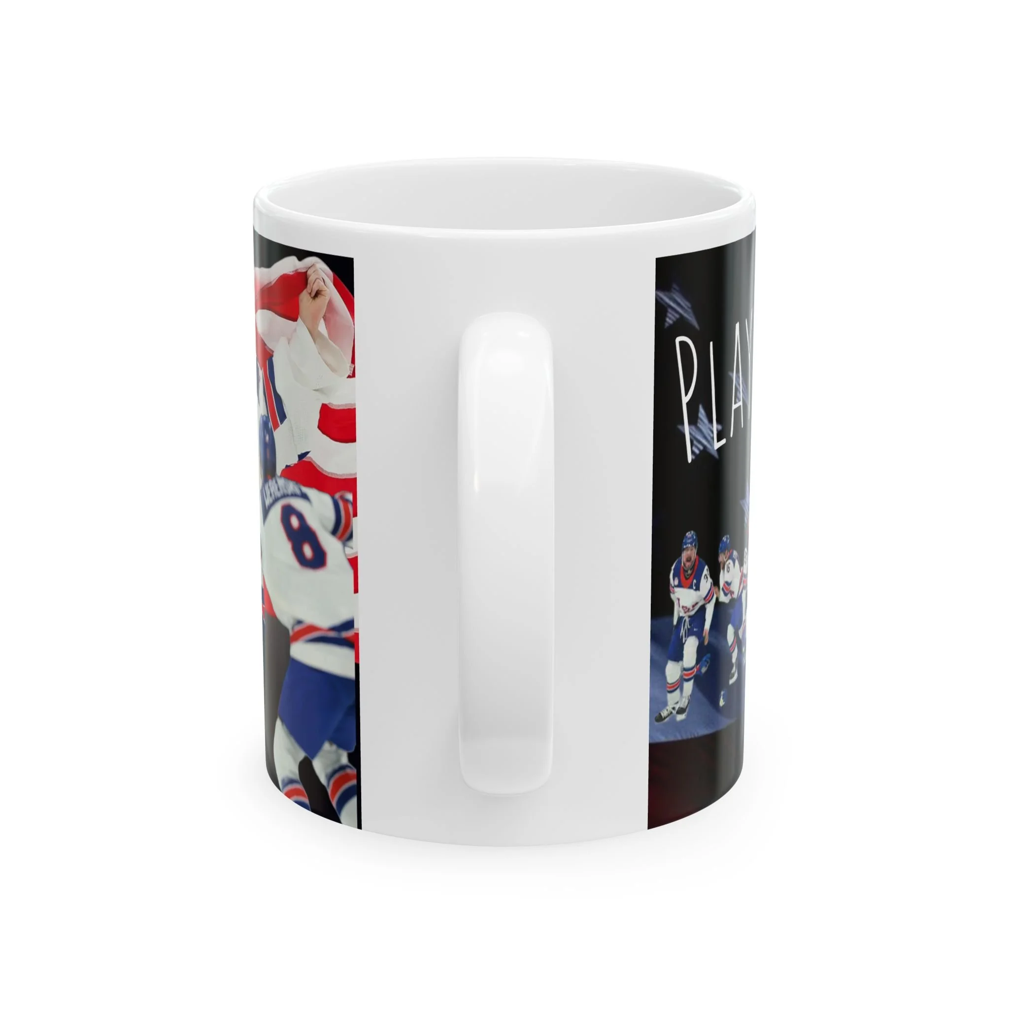 A glossy ceramic mug that brings the roar of the rink to your morning routine. Bold, vibrant printing wraps around the cup with energetic hockey action, American-flag accents, and hand-drawn lettering—each sip feels like you’re rink-side for a big game. The comfortable C-handle and smooth shiny finish make it an easy everyday companion, while durable white ceramic keeps the artwork bright and true. Microwave- and dishwasher-safe, lead- and BPA-free—this mug is built to be used, displayed, and passed down to fellow fans.